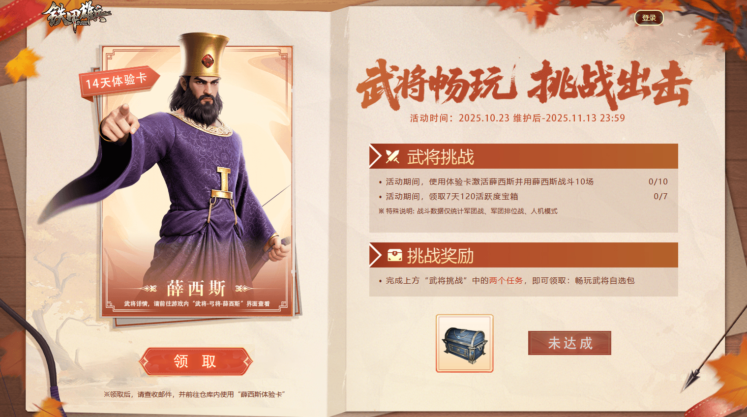 10月23日至11月13日活动期间,可直接在活动页面领取新武将薛西斯14天体验卡。没有门槛,全民点击就送,畅玩新武将!