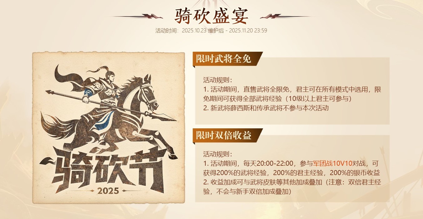 2025骑砍节将于10月23日随新武将、新赛季一同开启!新武将薛西斯、赵云限定皮肤免费送、超多豪礼。多重福利如下: