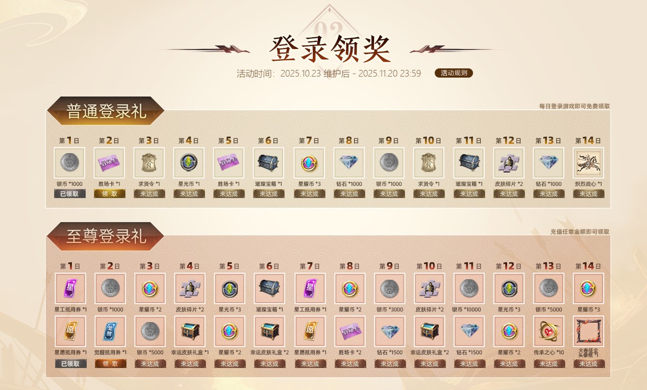 10月23日至11月20日活动期间,每日登录活动页面即可领取免费的14日登录礼奖励!充值任意金额,还可额外获得至尊登录礼,内含觉醒抵用券、骑砍节头像、动态头像框等众多奖励!