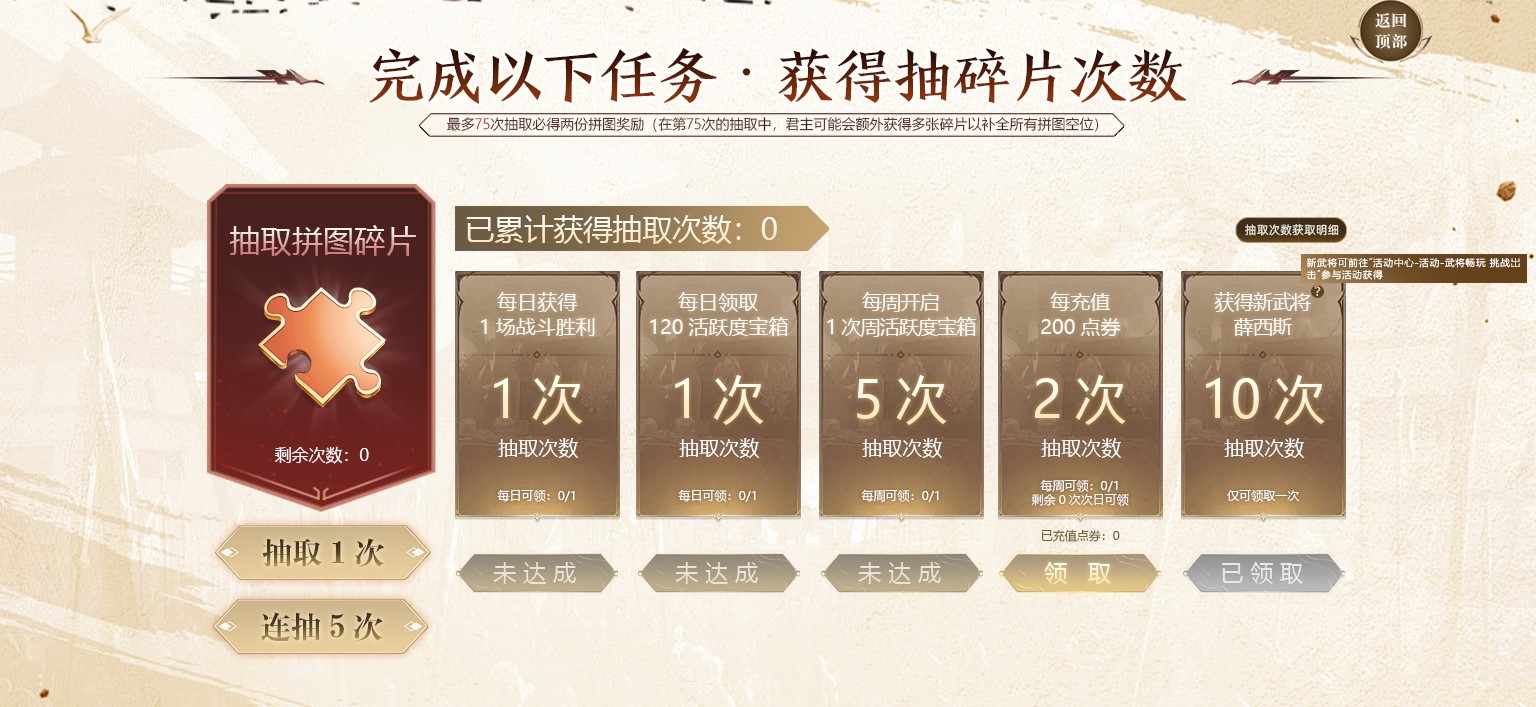 10月23日至11月13日活动期间,完成每日对战胜利、活跃度等任务,可获得拼图碎片抽取次数。战斗数据仅统计人机战、军团战、武将竞技、军团/武将竞技排位攻城战。