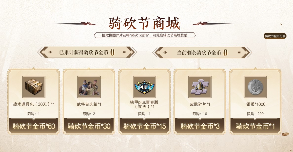 此外拼图活动中,每抽一次拼图碎片可同时获得一枚“骑砍节金币”,可在骑砍节商城兑换奖励,包含plus青春版、皮肤碎片、武将自选箱等丰厚奖励。若抽取到重复的拼图碎片,自动转换为一枚“骑砍节金币”。