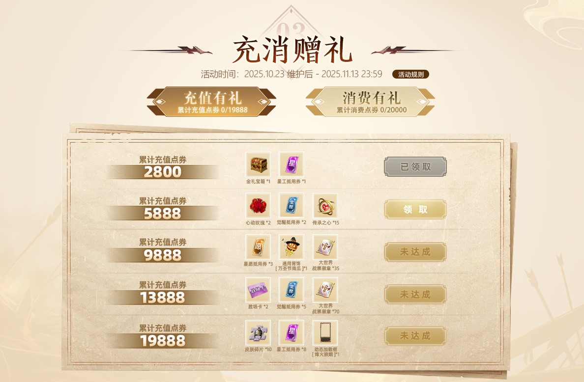 10月23日至11月13日活动期间,各位君主累计充值或累计消费达到对应额度,均可领取对应的福利赠礼,将会获得限定动态加载框【烽火狼烟】、通用背饰【万圣节南瓜】、大世界战票徽章、觉醒抵用券等丰厚奖励!