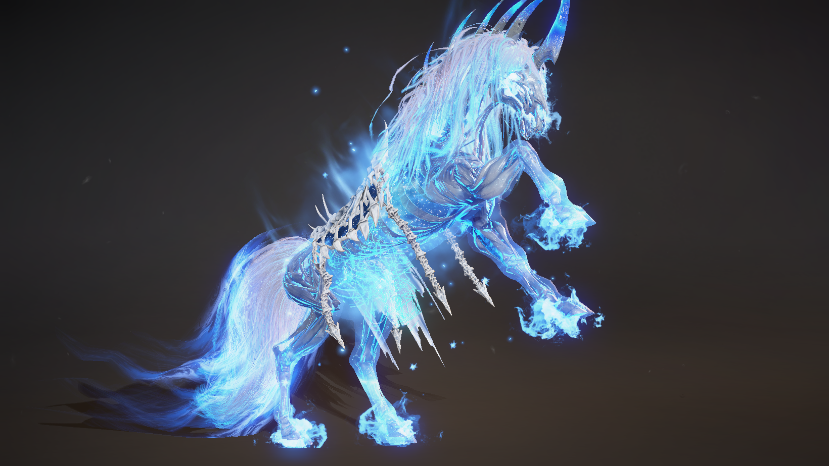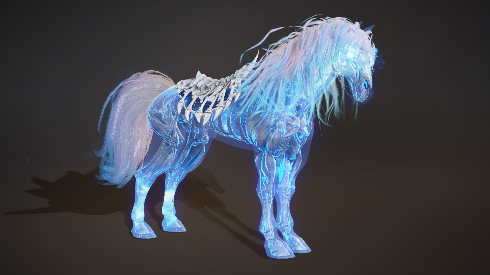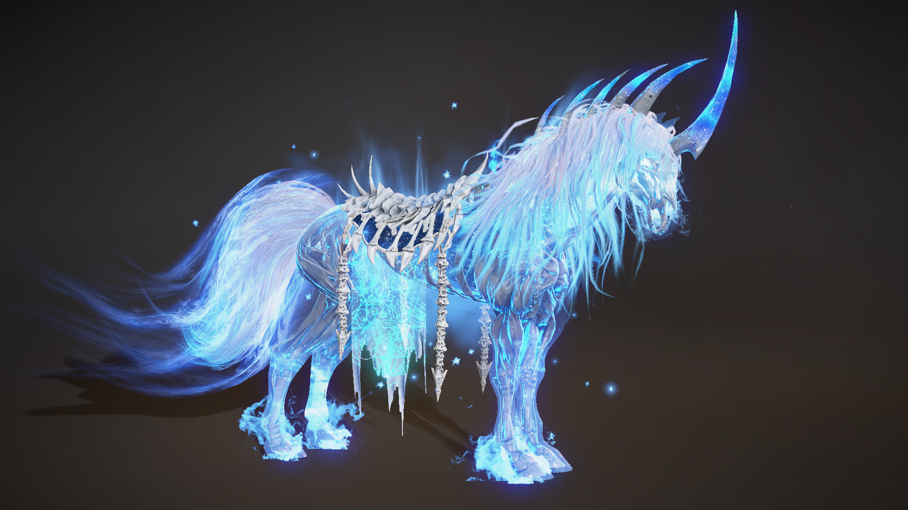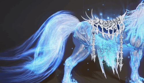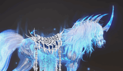 躯干和头部:身上披着刻画着神秘法阵的鞍具,上面法阵若隐若现,散发着神秘而危险的气息。头部生长有突出的骨刺,通透幽蓝,犹如千年寒冰。