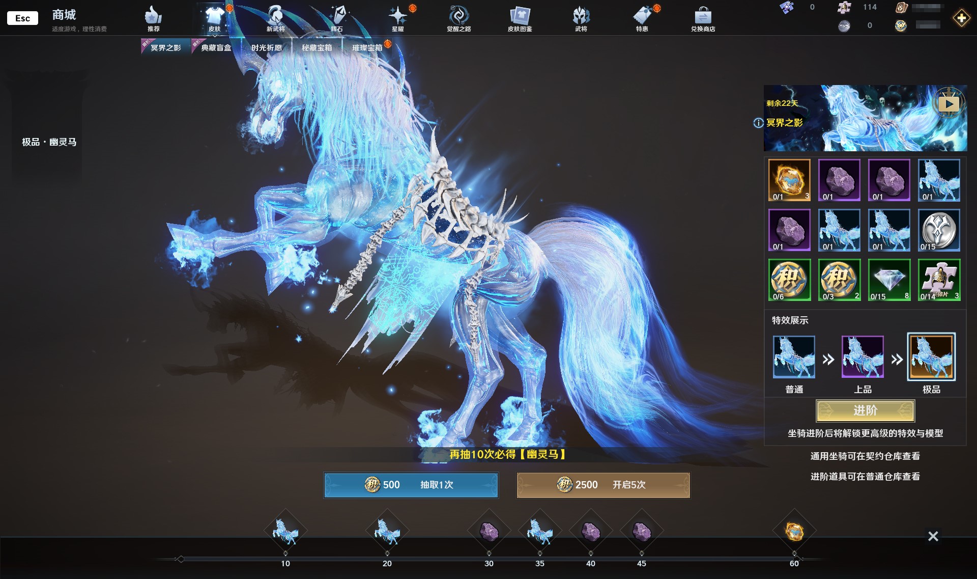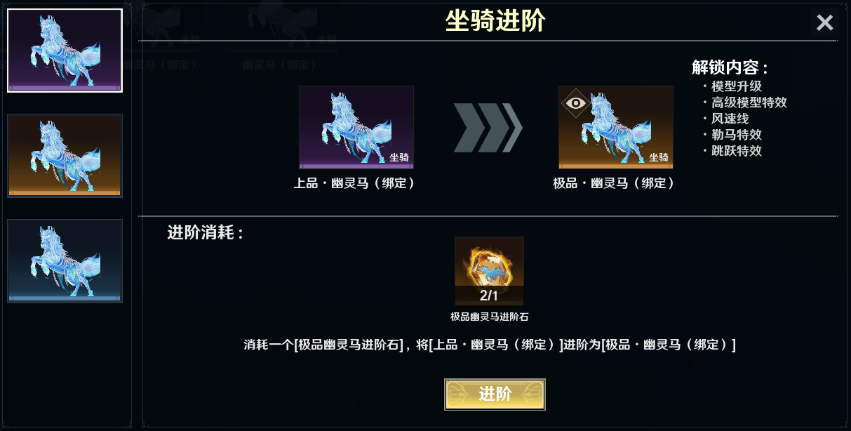 在抽取阶段,还可获得上品/极品幽灵马进阶石、觉醒积分等丰富奖励。使用进阶石,可为幽灵马进化升阶,将品质升为上品、极品,模型、表现特效也随之改变进阶。