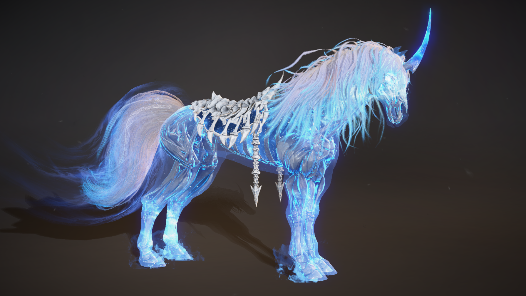 鬃毛和尾巴:燃烧着“冥界冷焰”一种幽蓝色的火焰,边缘泛着淡蓝色冷光,无风自动,火焰飘动时散落“暗影星屑”;鬃毛根部缠绕着细小的“符文锁链”,随呼吸轻微晃动。