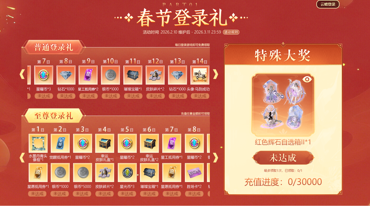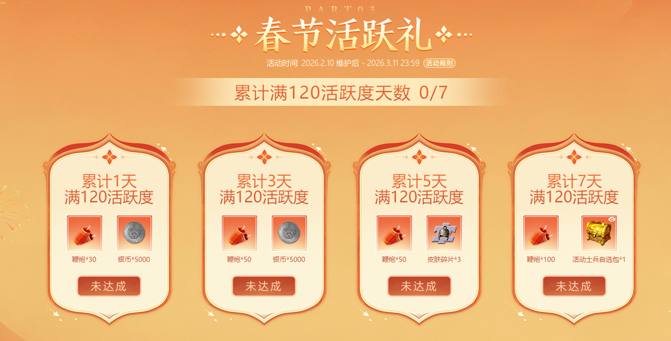 2月10日—3月11日活动期间,各位君主可通过完成每日任务积累活跃度,当满120活跃度分别累计达1/3/5/7天,可获得对应福利。