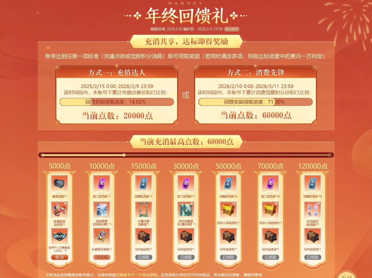 当点数达到相应条件,即可获得丰厚福利,包含马年自选包、新春配饰自选包、底座背景【栩栩丹青】、动态背景图【水墨丹青】、活动士兵皮肤自选包、红色辉石自选箱等尊贵好礼!