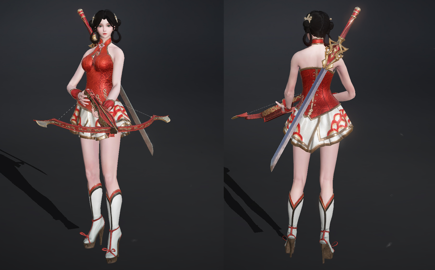 红裳映春,弓刀并携,佳人戎装在身,必当凯旋而归,庆贺新年。